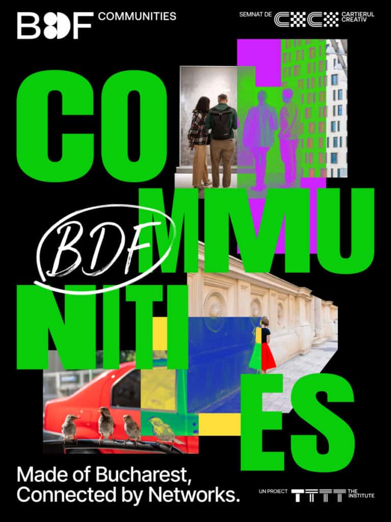 - BDF Communities – semnat de Cartierul Creativ, pune accent pe colaborare și pe energia comunităților creative care modelează identitatea urbană. Programul activează orașul prin intervenții urbane și expoziții curatoriate în trei microzone: Amzei, Grivița și Brezoianu.